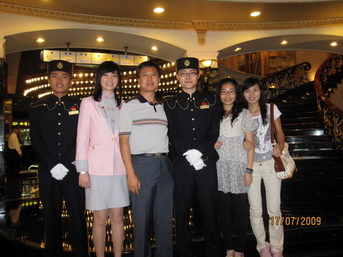 2009届酒店管理专业毕业生,就职于澳门新葡京酒店,担任礼宾员、接待员、总机员、西餐服务员工作。从左到右分别是:谢家奇、肖云青、王满元(就业办主任)、苗凯、殷华敏、王翠萍