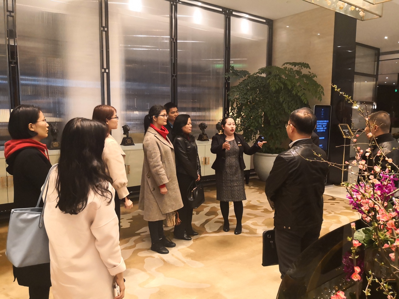 尔后,在屠总和阮经理的带领下,旅游管理学院教师参观了两家典型国际奢华酒店。第一站是南京圣和府邸豪华精选酒店(The Grand Mansion, a Luxury Collection Hotel, Nanjing),南京圣和投资集团有限公司总裁助理杨会接待我院一行参观了酒店的前厅、客房、餐厅、康乐等部门。酒店设计精致低调,装潢极具奢华美感和现代感,呈现出设计师的独特眼光,为客人创造出别具一格的体验。最后,双方在愉快的交流中达成见习、顶岗实习的合作。