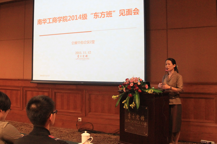 会议伊始,东方宾馆党委副书记、总经理陈白羽女士作致辞。陈总经理十分感谢我院输送了过百名的优秀实习生到宾馆实习、工作,同时欢迎14级东方班的同学们加入了“东方人”的大家庭。她用风趣幽默的话语,详细介绍了东方宾馆的行业发展历程和企业理念,通过“三个不同的角色”的例子,分享了“酒店人”的职业发展方向,祝愿同学们未来能在东方的大家庭中茁壮成长。