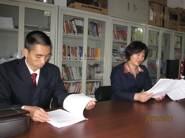 ▲企业领导认真翻阅碧水湾班人才培养方案(左:行政人事部副总监张彦浩、右:副总经理曾莉)