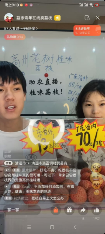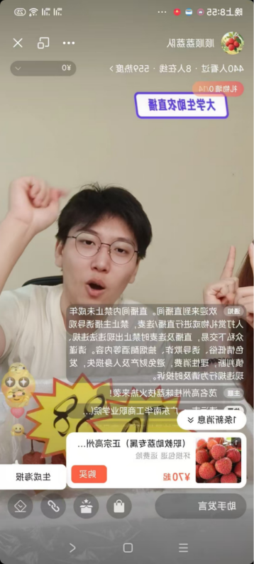 除此社群营销之外还有100多支团队正通过视频号、抖音等平台进行直播带货,他们以年轻化的表达方式、专业的产品讲解和创意互动,吸引了大批网友围观下单。直播间里,学生们化身“荔枝推荐官”,从品种特点到历史文化,从口感体验到食用方式,全方位展示茂名荔枝的独特魅力。不少团队还结合才艺表演、产地连线、限时优惠等丰富形式,让直播氛围热烈活跃,订单量持续攀升,进一步扩大了活动的社会影响力。