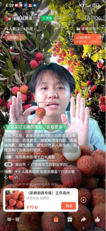 为积极响应广东省总工会的号召,助力岭南珍果荔枝的销售,广东南华工商职业学院携手各方力量,联动广东省十三所高职院校,发起“十万电商卖荔枝——校园电商挑战赛”活动,目前活动正在如火如荼地开展,各高校学子热情高涨,通过直播带货、社群营销、短视频推广等多元电商形式,全力助推岭南荔枝走向全国市场。师生团队日夜奋战,从选品策划到物流对接,从平台运营到品牌宣传,每一个环节都凝聚着青春智慧与创新活力,在实战中掀起了一场“荔枝营销”的校园电商热潮。