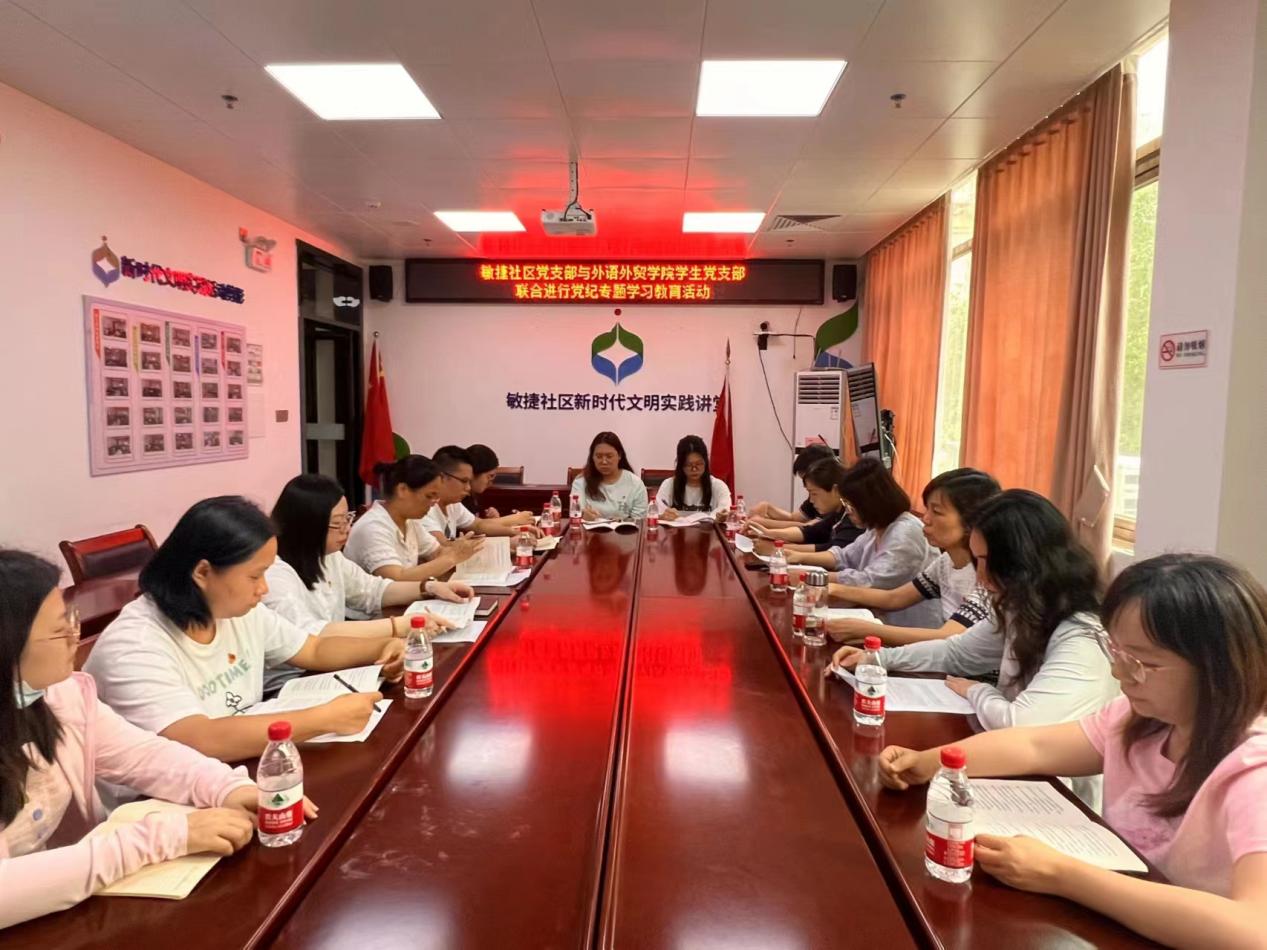 为进一步加强党性教育,提高党员的政治觉悟和纪律意识,确保党员队伍始终保持先进性和纯洁性,推动全面从严治党向纵深发展,2024年5月24日上午,外语外贸学院学生党支部与敏捷社区党支部、职教城社区党支部在东城街道敏捷社区党群服务中心联合开展党纪专题学习教育活动。