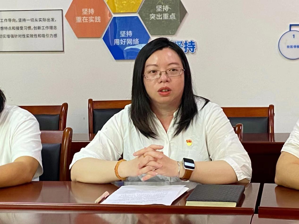 敏捷社区党支部书记刘卫怡同志领学《条例》第九章“对违反群众纪律行为的处分”,她提到作为基层党员干部必须要以时刻人民发展为中心,把人民利益放在首位,严格遵守党的纪律,做到廉洁自律、公私分明。