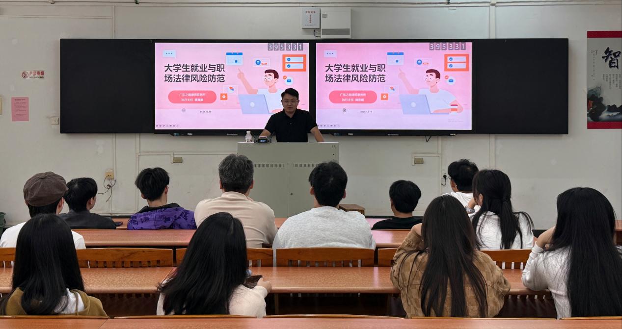 12月10日,我校数字商贸学院(下称“商贸学院”)学生党支部开展“我为群众办实事”项目,邀请广东之商律师事务所执行主任黄壹麒律师来校开展 “大学生就业与职场法律风险防范” 专题讲座。活动聚焦毕业生求职与职场核心痛点,以专业法律解读筑牢就业法律防线,助力学子平稳开启职场生涯。