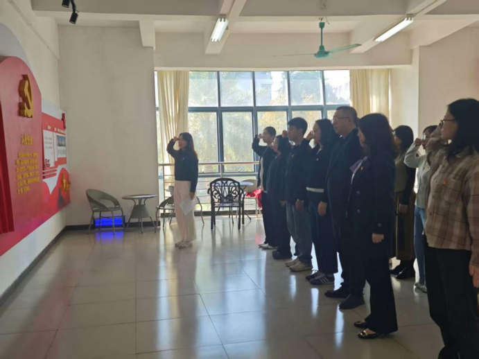 支部副书记唐嘉敏宣读预备党员接收批复,新成员的加入为党组织注入新鲜血液与蓬勃活力。支部组织委员曾晶带领全体党员、预备党员,于图书馆二楼党建长廊开展宣誓活动。肃穆庄重的氛围里,全体人员高举右拳,重温入党誓词。铿锵有力的誓言回荡耳畔,凝聚起坚守初心、勇担使命的奋进力量。