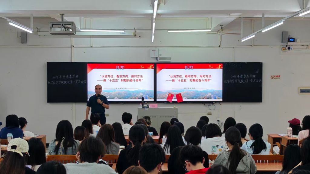 4月10日,校党委委员、数字商贸学院院长李新以《认清方位,看准方向,用对方法——做“十五五”时期的奋斗青年》为题,为110余名学生代表讲授2026年度春季学期第一堂思政课。
