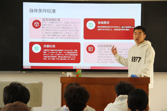 张霖围绕2026年春季征兵工作展开全面讲解,从年龄、学历、身体状况等维度详解征兵基础条件,指导报名信息填写要点,助力学生规避报名误区。同时,他聚焦大学生关切的学业保障、学费补偿代偿、地方经济补贴等优待政策,结合自身军旅经历,分享从校园到军营的蜕变,诠释参军对个人意志与能力的锤炼价值。