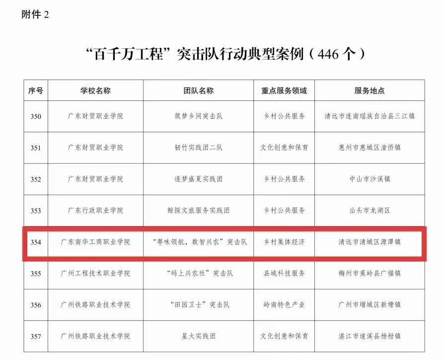 12月22日,共青团广东省委员会发布了《关于2025年广东大中专学生志愿者暑期文化科技卫生“三下乡”社会实践活动暨广东青年大学生“百千万工程”突击队行动品牌项目、典型案例的公示》。广东南华工商职业学院数字商贸学院“粤味领航,数智兴农”突击队凭借“羽链通途——从田间到云端,数据调研+新媒体赋能的黄金链路”项目,凭借专业的技术实力和突出的实践成效,成功获评广东省“百千万工程”突击队行动典型案例!