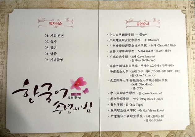 中山大学、广东外语外贸学院和深圳职业技术学院等17所华南地区院校参加了此次活动。我校的两个节目歌曲串烧《我的女孩》和舞蹈《NH GIRLS》作为压轴节目参加表演,充分展示了我校国实(中韩)和应韩两个专业学生韩语水平,节目获得了满场师生喝彩。