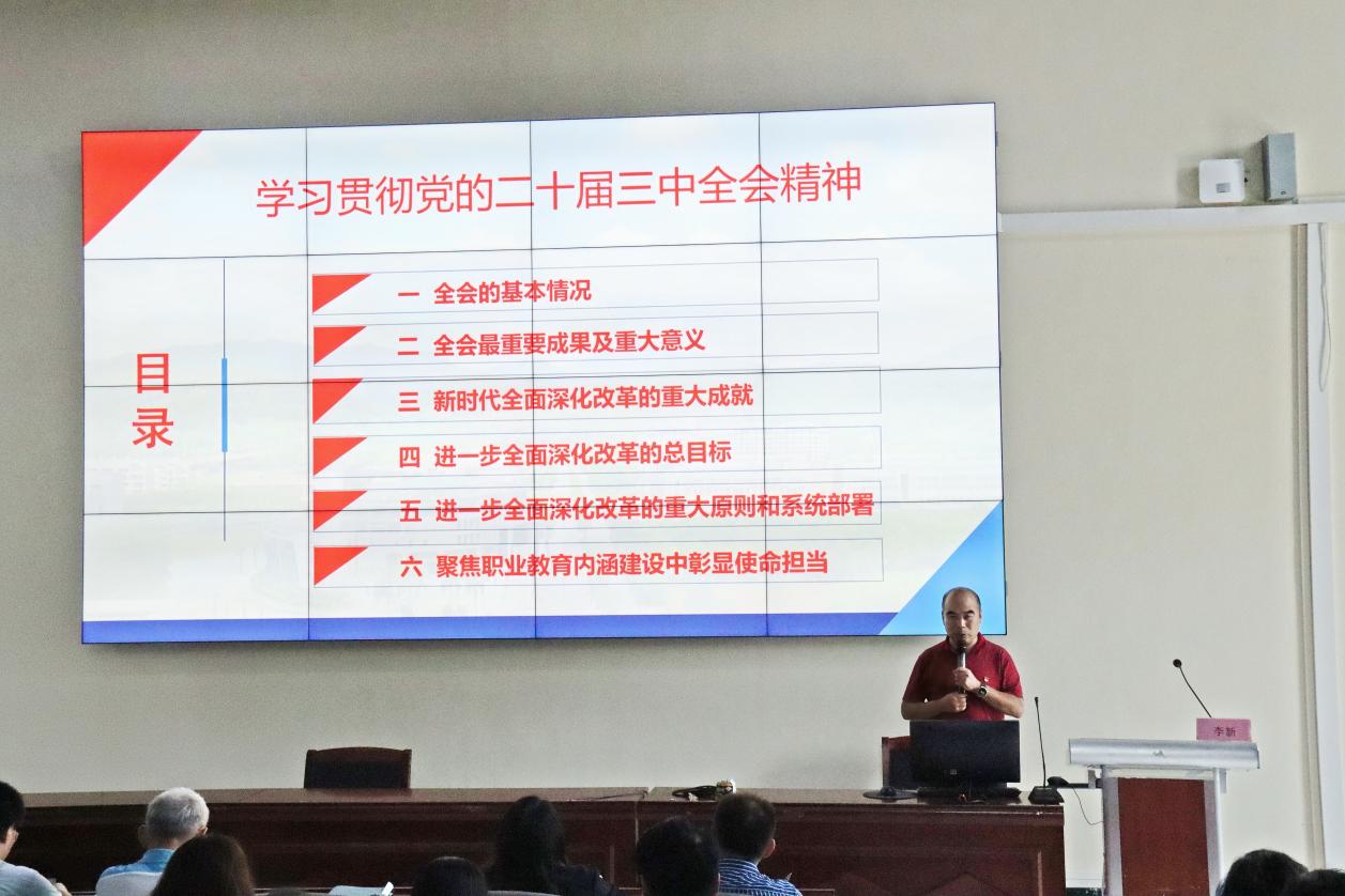 李新同志对党的二十届三中全会精神进行了全面而系统的阐述,涵盖了其基本情况、重要成果、深远意义以及新时代全面深化改革所取得的重大成就等多个维度。他强调,全体师生应持续深入学习并贯彻党的二十届三中全会精神,内化于心、外化于行,积极投身于推动学校高质量发展的实际行动之中,为实现既定目标贡献力量。