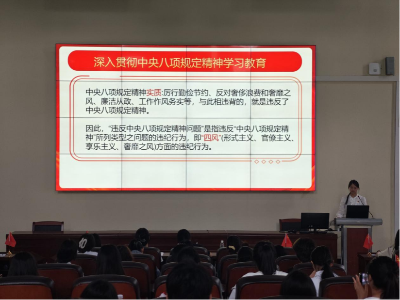 为深入贯彻中央八项规定及其实施细则精神,筑牢作风建设基石,深化纪律规矩意识,6月4日,数字商贸学院学生党支部副书记唐嘉敏紧扣中国共产党的作风建设主题在一教101报告厅为支部部分党员及入党积极分子讲授党课。