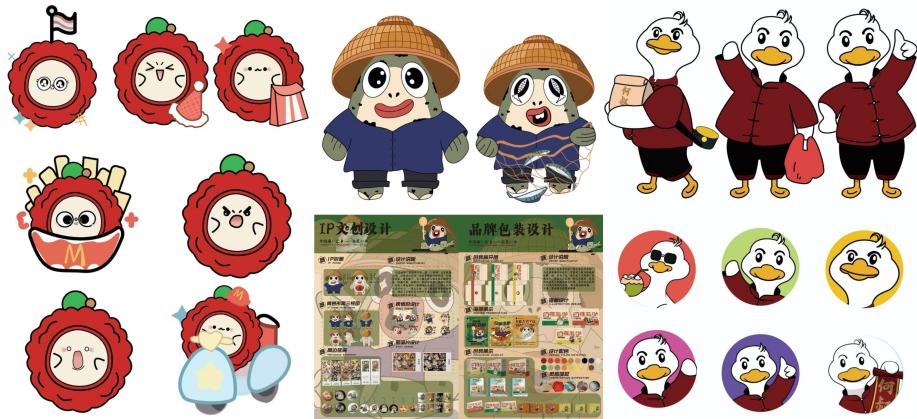 珠湾青云实践团为御荔园荔枝和白蕉海鲈分别打造了“斗荔荔”、“小客”、“蕉宝”等IP形象,并制作徽章、挂饰、钥匙扣、明信片等文创产品,还对何叔公鸭扎包Logo进行了二次创作。这些IP形象成为连接农产品增值与文旅体验的纽带,通过视觉赋能提升产品附加值和品牌形象,推动荔枝产业、水产企业及非遗产品升级。