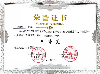 2022-2023学年,获广东南华工商职业学院5•25心理健康月之“手捧一书•心行万里”读书分享比赛三等奖。