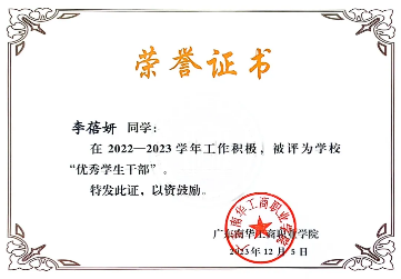 2022-2023学年,获广东南华工商职业学院“优秀学生干部”称号;