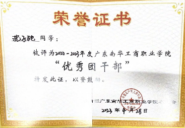 2022-2023年,获广东南华工商职业学院“优秀学生干部”称号;