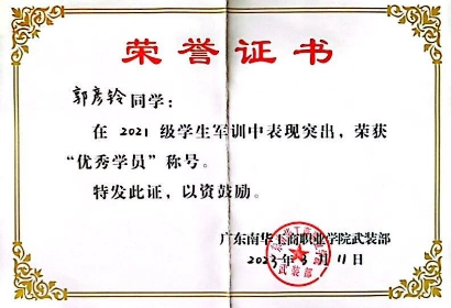 2022-2023学年,获广东南华工商职业学院2021级学生军训“优秀学员”称号;