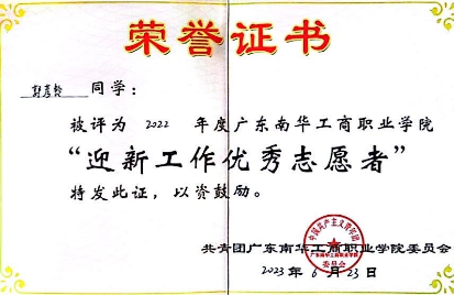 2022-2023年度,获广东南华工商职业学院“迎新工作优秀志愿者”称号;