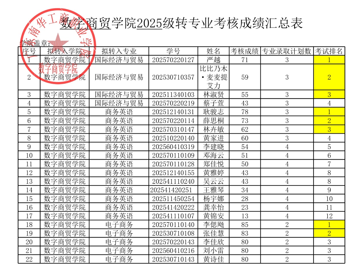 根据学校《关于2025级在校生开展转专业工作的通知》,2025年12月22日至26日,数字商贸学院对申请转入本学院的同学进行了转专业笔试考核,现将成绩公示如下:
