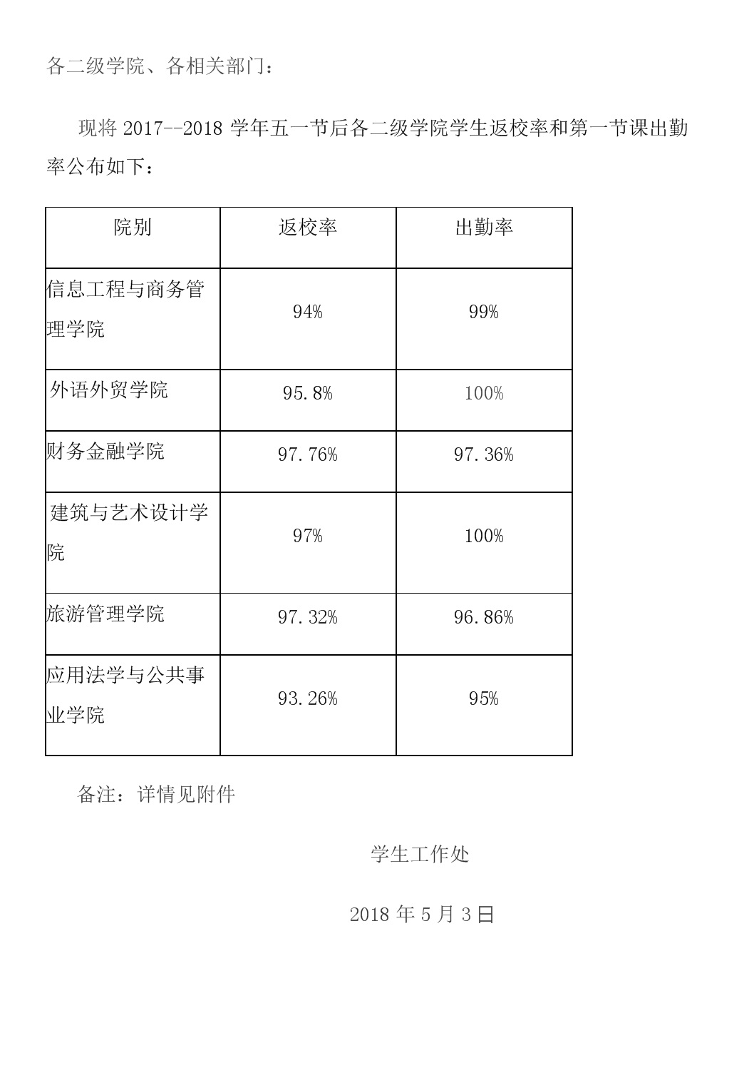 关于2017--2018学年五一节后二级学院学生返校率和第一节课出勤率的公布