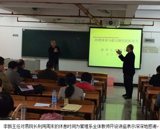 讲座结束后,系李新主任再次对易院长利用周末的休息时间为管理系全体教师开设讲座表示深深地感谢;并结合易院长的讲座内容,号召全系教师以学院发展为己任,教学上注重内涵建设,提高教学质量,扎实工作,为系、学院更上一层楼而努力。