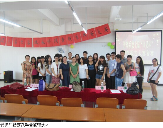 2014年6月20日星期五管理系在清远校区实验楼316举办了第七届风采杯调查报告大赛复赛。此次活动的评委由刘亚玲老师、陆淑珍老师、吴丽蓉老师、胡元利老师、章小剑老师担任,总共吸引了13级共11支队伍参加此次的比赛。