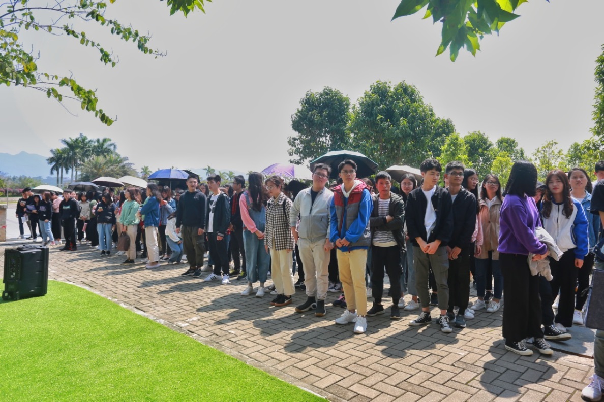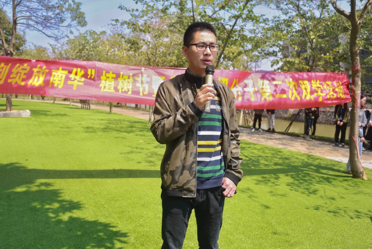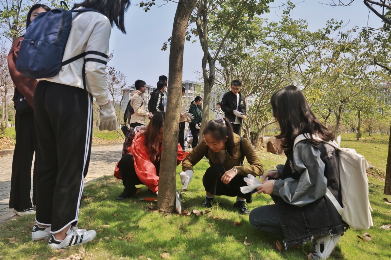 在活动开始前,负责本次活动的工作人员已将活动物资运到了图书馆等候同学们的到来。参与人员与工作人员集合完毕后,便由崔宁老师进行动员指导,崔宁老师强调“首先,希望同学们能够重视本次植树节暨双学活动,以小见大,从思想和行动上认真学习并吸收党的基本理论知识,从小事上一点一滴了解国家的创新发展理念;其次,同学们在整个活动的过程中要注意安全,防止发生任何安全风险”。接着,工作人员将活动所需工具分发到双学小组的各个组长中,由组长分发下去并分配各自任务,本次活动共有双学小组33组,1至15组负责紫荆林区域,其余小组则负责7栋宿舍区域。活动进行过程中,同学们仔细寻找草地垃圾,互相帮忙,松土施肥,使负责区域的环境变得焕然一新、绿意盎然、生机勃勃;最后,同学们将各自工作完成后,看着环境的改善露出了欣慰的笑容,有些同学还把自己的劳动成果使用相机记录下来,在同学们的欢声笑语中,本次活动圆满落下帷幕!