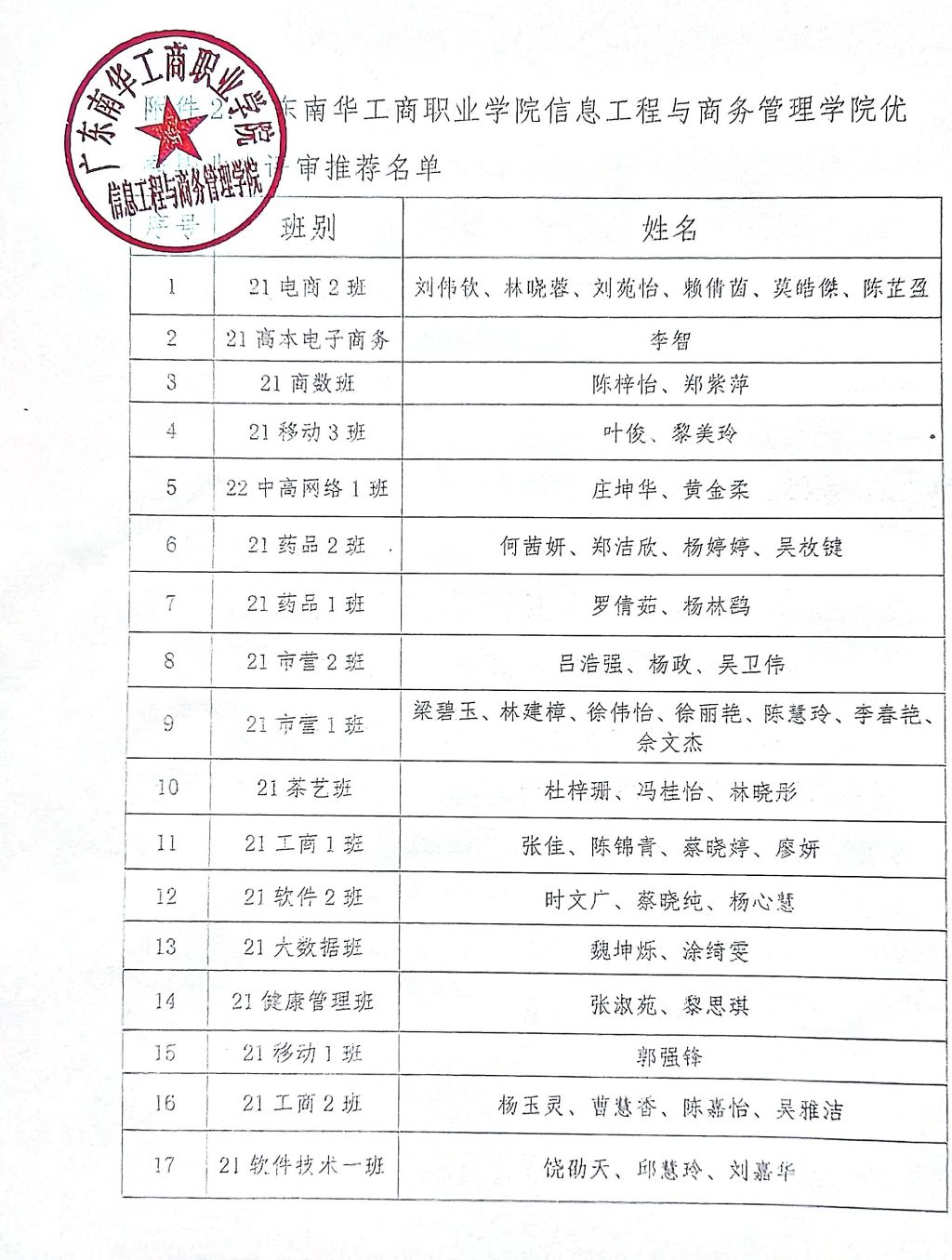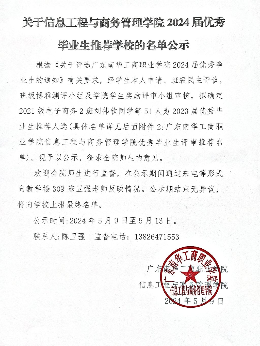 根据《关于评选广东南华工商职业学院2024届优秀毕业生的通知》有关要求,经学生本人申请、班级民主评议,班级博雅测评小组及学院学生奖励评审小组审核,拟确定2021级电子商务2班刘伟钦同学等51人为2023届优秀毕业生推荐人选(具体名单详见后面附件2:广东南华工商职业学院信息工程与商务管理学院优秀毕业生评审推荐名单)。现予以公示,征求全院师生的意见。