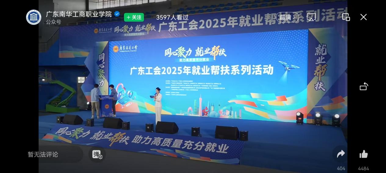 2025 年 12 月 9 日,广东南华工商职业学院清远校区成功举办 “同心得聚力 就业帮扶 助力高质量充分就业 —— 广东工会 2025 年就业帮扶系列活动”。活动期间,学校教育技术与信息中心凭借专业技术支撑与高效响应能力,为活动直播环节提供了稳定可靠的网络保障,助力就业帮扶工作精准落地。
