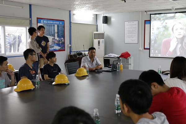 到工地后,首先来到会议室开会,会议上分别由承包方广州富利建筑安装工程有限公司陈炬豪工长做了安全教育,强调进入工地的重要事项,由佛山市保利心语花园三期一标项目监理部黎凯艺专业监理工程师介绍了这个项目的工程概况、施工特点、施工难度及所应用到的新技术。