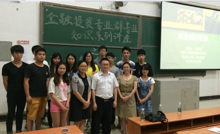 2014年5月26日晚,在我院清远校区教学楼301阶梯教室,应金融系金融管理与实务专业的邀请,中国工商银行清远市分行财务会计部副总经理肖志明先生,为清远校区金融管理与实务专业的100多名同学们进行了“金融投资专业群专业知识系列讲座之三----商业银行实务”。金融系主任唐晓林、金融管理与实务教研室主任董芳、专业教师陈瑞红等参加了此次讲座。