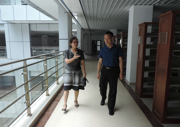 座谈会后,我院人员到青职院教师公寓、教学楼、图书馆、网络中心实地参观,在教师公寓,大家细致观察了大楼设计与室内设置;在图书馆,众人的目光纷纷被两台新式的自助借书机所吸引,并认真了解了该机器的功能与使用方法。
