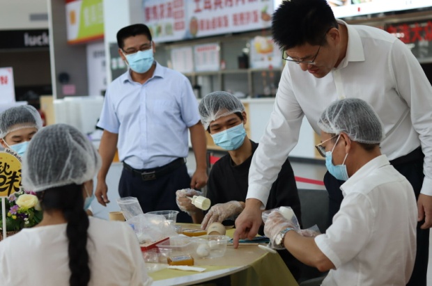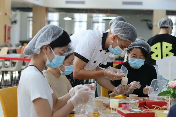 在清远校区制作月饼活动现场,党委书记、校长林海与师生们一起,擀皮、包馅、压模,体验传统工艺的独特魅力。师生们看着一个个精美的月饼在自己的手中成型,带着制作的喜悦,展示着自己的作品,拍照留念,活动现场欢声笑语不断。无论是初来乍到南华大家庭的“萌新”,还是在南华生活成长多年的“土著”,都感受到了南华满满的关爱,喜悦之情溢于言表。
